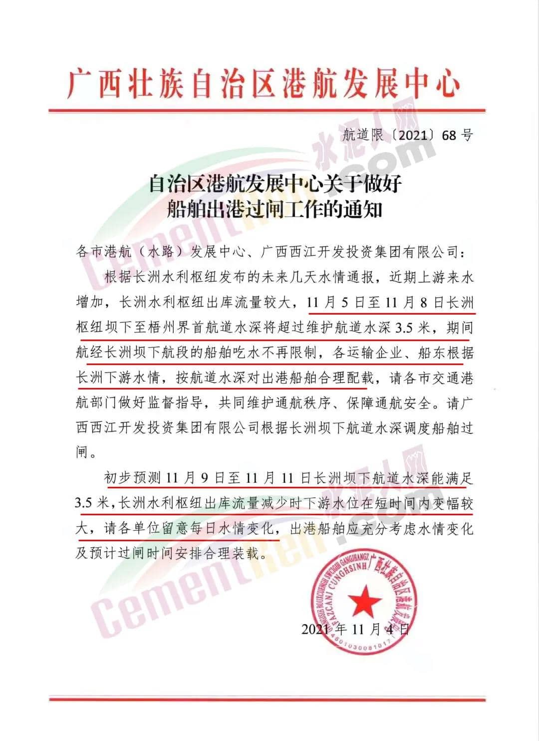 11月4日,廣西壯族自治區(qū)港航發(fā)展中心發(fā)布《自治區(qū)港航發(fā)展中心關(guān)于做好船舶出港過閘工作的通知》給各市港航(水路)發(fā)展中心、廣西西江開發(fā)投資集團(tuán)有限公司稱,根據(jù)長(zhǎng)洲水利樞紐發(fā)布的未來幾天水情通報(bào),近期上游來水增加,長(zhǎng)洲水利樞紐出庫(kù)流量較大,11月5日至11月8日長(zhǎng)洲樞紐壩下至梧州界首航道水深將超過維護(hù)航道水深3.5米,期間航經(jīng)長(zhǎng)洲壩下航段的船舶吃水不再限制,各運(yùn)輸企業(yè)、船東根據(jù)長(zhǎng)洲下游水情,按航道水深對(duì)出港船舶合理配載。