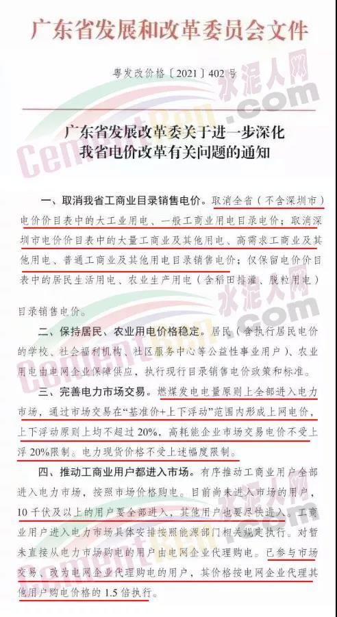 廣東省發(fā)改委印發(fā)(粵發(fā)改價(jià)格[2021)402號(hào))文件,廣東省內(nèi)所有工商業(yè)用電都進(jìn)入市場(chǎng)了,電價(jià)漲幅接近20%。已參與市場(chǎng)交易、改為電網(wǎng)企業(yè)代理購(gòu)電的用戶,其價(jià)格按電網(wǎng)企業(yè)代理其他用戶購(gòu)電價(jià)的的1.5倍執(zhí)行。