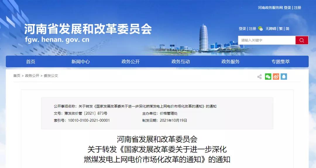 河南省內(nèi)燃煤發(fā)電電量原則上全部進(jìn)入市場(chǎng),上網(wǎng)電價(jià)通過市場(chǎng)交易在“基準(zhǔn)價(jià)+上下浮動(dòng)”范圍內(nèi)形成,其中,基準(zhǔn)價(jià)為0.3779元/千瓦時(shí),上下浮動(dòng)原則上均不超過20%。高耗能企業(yè)市場(chǎng)交易電價(jià)不受上浮20%限制,電力現(xiàn)貨價(jià)格不受上下浮動(dòng)不超過20%限制。自2021年10月15日起,全面取消工商業(yè)目錄銷售電價(jià),僅保留居民生活、農(nóng)業(yè)生產(chǎn)目錄銷售電價(jià)。自2021年10月15日起,工商業(yè)用戶原則上全部進(jìn)入電力市場(chǎng)。