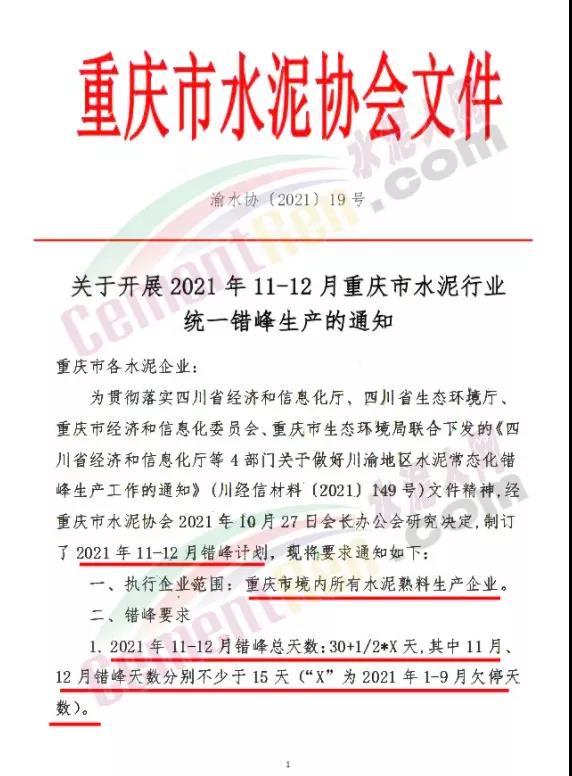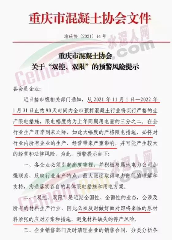 綜上所述,各地針對(duì)于高耗能企業(yè)的電價(jià)控制以及限電、限產(chǎn)要求加嚴(yán),此前重慶市混凝土協(xié)會(huì)發(fā)布《關(guān)于“雙控、雙限”的預(yù)警風(fēng)險(xiǎn)提示》要求從 2021年11月1日~2022年1月31日止約90天時(shí)間內(nèi)全市預(yù)拌混凝土行業(yè)將實(shí)行嚴(yán)格的生產(chǎn)限電措施,限電幅度約為上年同期用電量的三分之二。同期,重慶市水泥協(xié)會(huì)發(fā)文要求轄區(qū)水泥企業(yè)自11月1日起執(zhí)行錯(cuò)峰生產(chǎn)。水泥成本增加同時(shí)供應(yīng)量減少,水泥價(jià)格應(yīng)聲上漲100-150元/噸。但因下游商混企業(yè)同樣面臨限電限產(chǎn),水泥價(jià)格提漲落實(shí)情況不理想。