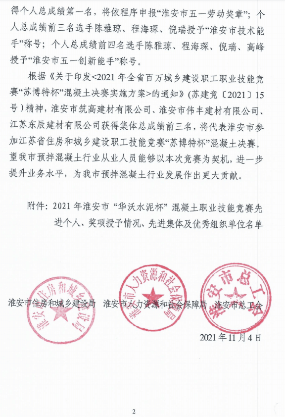 日前,?2021年淮安市“華沃水泥杯”混凝土職業(yè)技能競(jìng)賽已圓滿完成各項(xiàng)工作,共有16家預(yù)拌混凝土生產(chǎn)企業(yè)的48名選手組隊(duì)參加,涌現(xiàn)出一批理論扎實(shí)、技術(shù)過(guò)硬的選手,一批先進(jìn)個(gè)人和先進(jìn)集體脫穎而出。