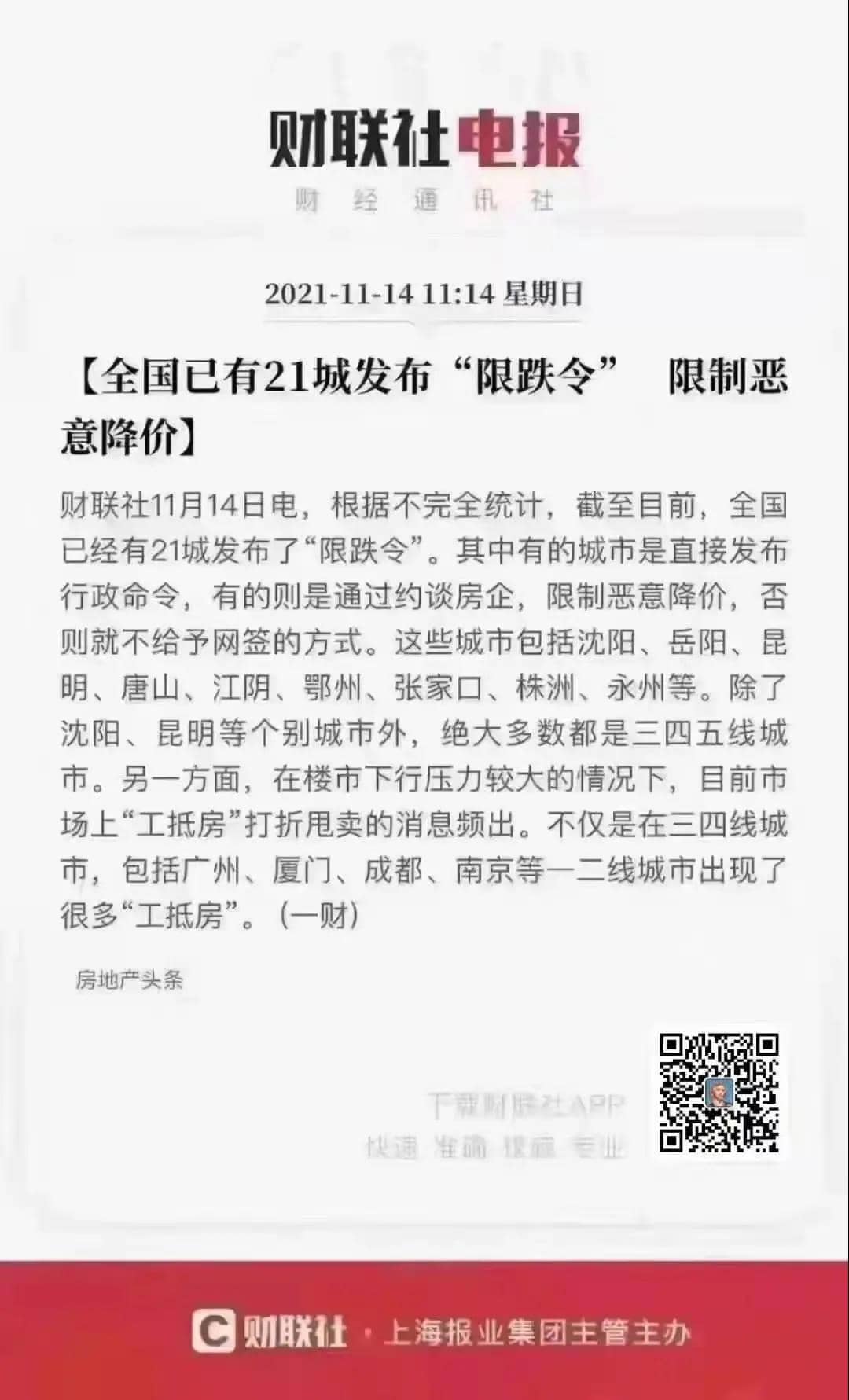 如果按照目前這種爆雷的節(jié)奏,房地產(chǎn)行業(yè)會出現(xiàn)更大的亂子。因此,很多地區(qū)緊急發(fā)布“限跌令”。截至目前,全國已經(jīng)有21城發(fā)布了“限跌令”,包括沈陽、岳陽、昆明、唐山、江陰、鄂州、張家口、株洲、永州等。除了沈陽、昆明等個別城市外,絕大多數(shù)都是三四五線城市。
