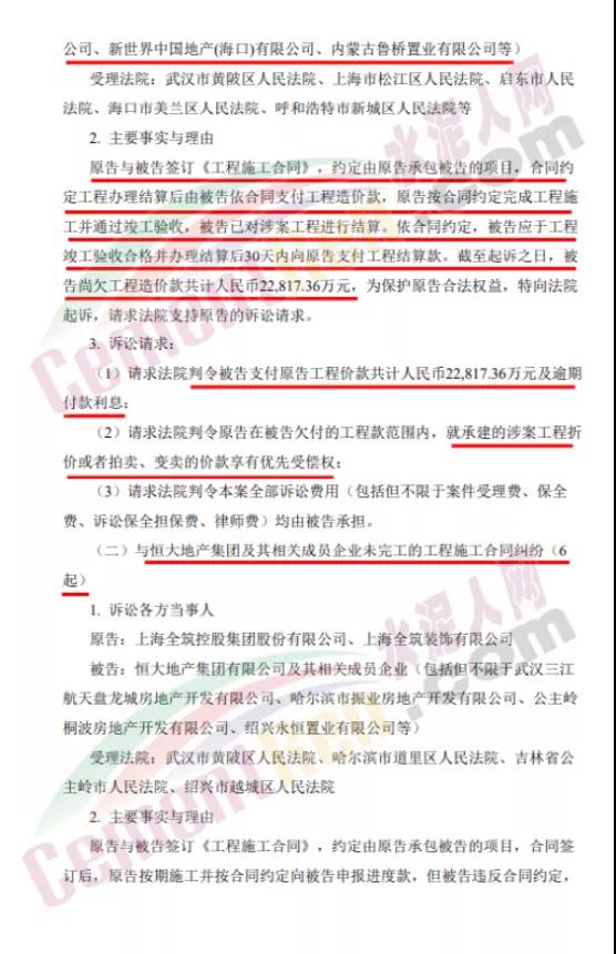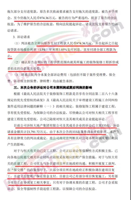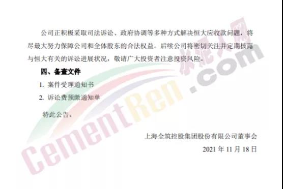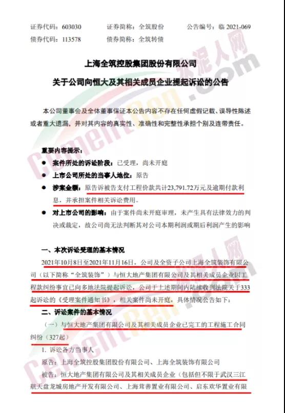 11月17日晚間,全筑股份公告稱,公司及全資子公司全筑裝飾與恒大地產集團及其相關成員企業(yè)因工程款糾紛事宜已向多地法院提起訴訟。全筑股份訴恒大方面支付工程價款共計2.38億元及逾期付款利息,并承擔案件相關訴訟費用。全筑股份表示,正積極采取司法訴訟、政府協調等多種方式解決恒大應收款問題。