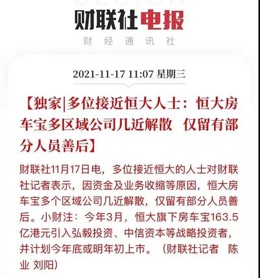 同期,多位接近恒大的人士表示,因資金及業(yè)務收縮等原因,恒大房車寶多個區(qū)域公司幾近解散,僅留有部分人員善后。
