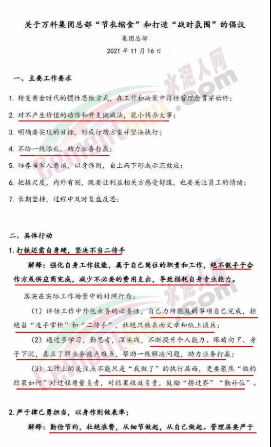 同期,萬科總部下發(fā)了一份主題為《關于萬科集團總部“節(jié)衣縮食”和打造“戰(zhàn)時氛圍”的倡議》,共提出7點工作要求兩條具體行動。