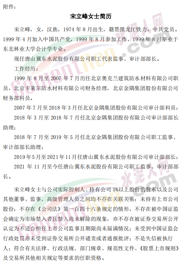 日前,冀東水泥發(fā)布《唐山冀東水泥股份有限公司關(guān)于監(jiān)事辭職及選舉職工代表監(jiān)事的公告》稱,楊北方先生申請辭去公司第九屆監(jiān)事會(huì)監(jiān)事職務(wù),辭職后,仍在公司擔(dān)任財(cái)務(wù)資金部部長職務(wù)。經(jīng)公司職工民主選舉,宋立峰女士當(dāng)選為公司職工代表監(jiān)事,任期至公司第九屆監(jiān)事會(huì)換屆。具體公告如下: