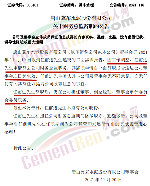 ?同日,唐山冀東水泥股份有限公司發(fā)布關(guān)于財(cái)務(wù)總監(jiān)辭職的公告稱,因工作調(diào)整,任前進(jìn)先生申請辭去公司財(cái)務(wù)總監(jiān)職務(wù),任前進(jìn)先生辭職后,仍在公司擔(dān)任董事、副總經(jīng)理、董事會(huì)審計(jì)委員會(huì)委員職務(wù)。具體公告如下: