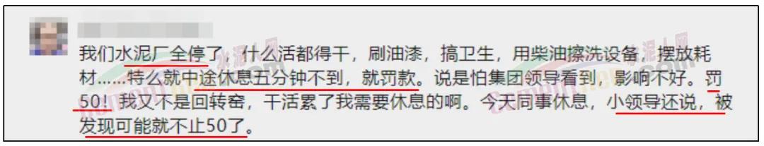 有網(wǎng)友留言稱:“水泥廠全停了,員工什么活都得干。刷油漆,搞衛(wèi)生,用柴油擦洗設(shè)備,擺放耗材……中途休息五分鐘不到,就罰款。說(shuō)是怕集團(tuán)領(lǐng)導(dǎo)看到,影響不好。罰50!我又不是回轉(zhuǎn)窯,干活累了我需要休息的啊。今天同事休息,小領(lǐng)導(dǎo)還說(shuō),被發(fā)現(xiàn)可能就不止50了。”