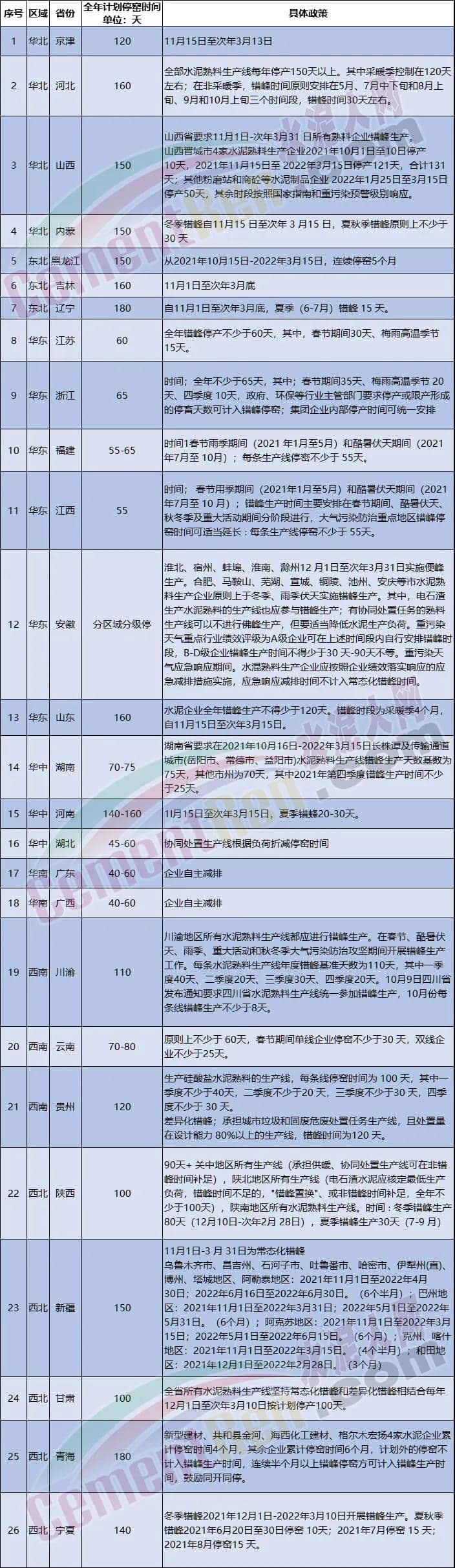 截止目前已經(jīng)有27個(gè)省市自治區(qū)發(fā)布了水泥企業(yè)錯(cuò)峰生產(chǎn)計(jì)劃。其中遼寧省和青海省絕大多數(shù)企業(yè)停限產(chǎn)時(shí)間達(dá)到180天以上。