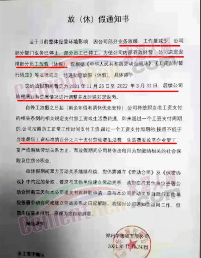 11月24日,河南鄭州華南城發(fā)出放假通知稱,鑒于目前整體經(jīng)營(yíng)環(huán)境影響,因公司部分業(yè)務(wù)放緩,工作量減少,公司部分部門業(yè)務(wù)已停止,部分員工已停工。為使公司內(nèi)部有效經(jīng)營(yíng),公司決定安排部分員工放假(休假):2021年11月26日至2022年3月31日,共計(jì)4個(gè)多月。休假期間,公司將支付不低于本地最低工資60%作為勞動(dòng)者生活費(fèi),社保和公積金正常繳納。