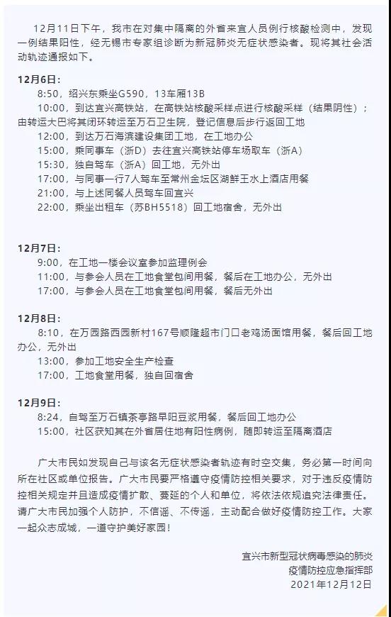 日前 ,江蘇宜興市通報發(fā)現(xiàn)一例新冠肺炎無癥狀感染者。通報顯示,該感染者6日從浙江紹興到宜興,期間在萬石海濱建設(shè)集團工地等區(qū)域活動,從其活動軌跡可見,該感染者曾參加監(jiān)理例會和工地安全生產(chǎn)檢查。經(jīng)排查,密切接觸者共63人,次密切接觸者共560人。全部集中隔離并規(guī)范開展核酸檢測,已出結(jié)果均為陰性。