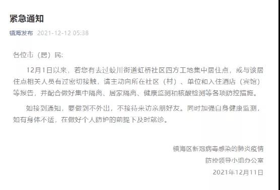 繼江蘇宜興之后,浙江寧波同一工地13人確診。浙江寧波鎮(zhèn)海區(qū)發(fā)布緊急通知,要求自12月1日以來,有去過蛟川街道虹橋社區(qū)四方工地集中居住點,或與該居住點相關(guān)人員有過密切接角的人員主動向所在社區(qū)(村)、單位和入住酒店(賓館)等報告 。
