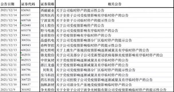 12月13日0-24時,新增確診病例45例,其中杭州市2例、寧波市4例、紹興市38例、境外輸入1例(剛果金輸入),已排查密切接觸者均已實施集中隔離。浙江全省已累計納入隔離管控540430人,其中集中隔離52824人,居家健康觀察21835人,日常健康監(jiān)測465771人。近20家A股上市企業(yè)發(fā)布停產(chǎn)公告,且未明確復(fù)產(chǎn)時間。
