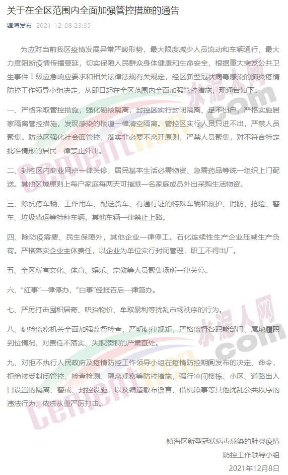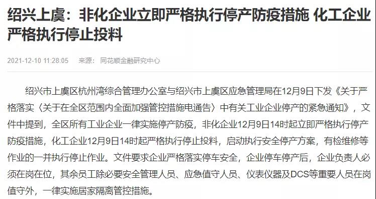 全區(qū)所有工業(yè)企業(yè)一律實施停產(chǎn)防疫,非化企業(yè)12月9日14時起立即嚴格執(zhí)行停產(chǎn)防疫措施,化工企業(yè)12月9日14時起嚴格執(zhí)行停止投料,啟動執(zhí)行安全停產(chǎn)方案,有檢維修等作業(yè)的一并執(zhí)行停止作業(yè)。