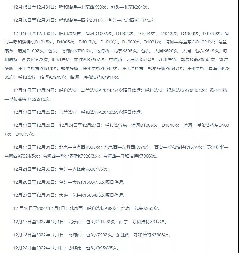呼和浩特:部分列車臨時停運