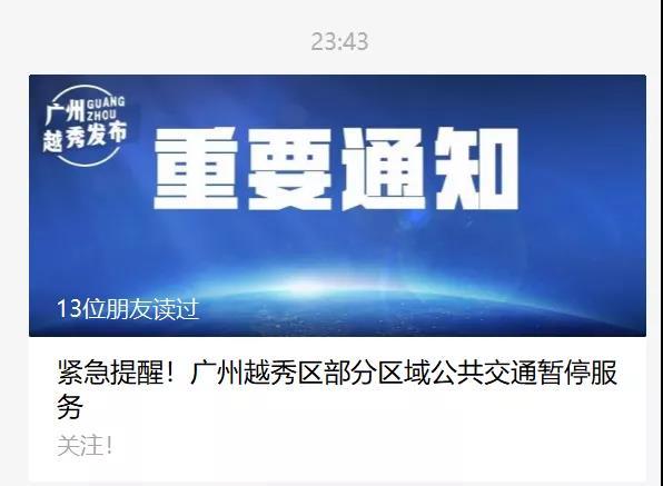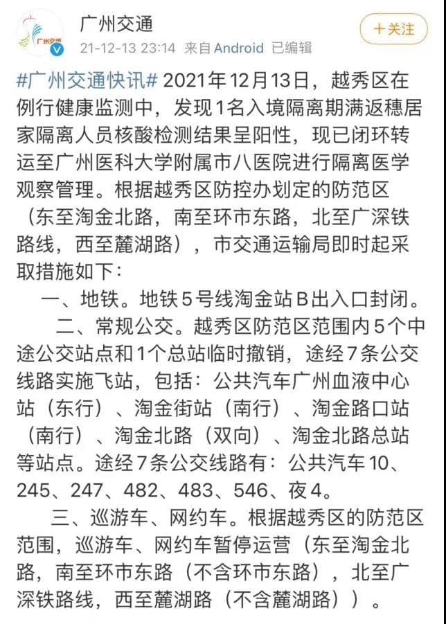 廣州越秀區(qū)部分區(qū)域公共交通暫停服務(wù)。根據(jù)越秀區(qū)防控辦劃定的防范區(qū)(東至淘金北路,南至環(huán)市東路,北至廣深鐵路線,西至麓湖路),廣州市交通運輸局即時起采取措施如下:
