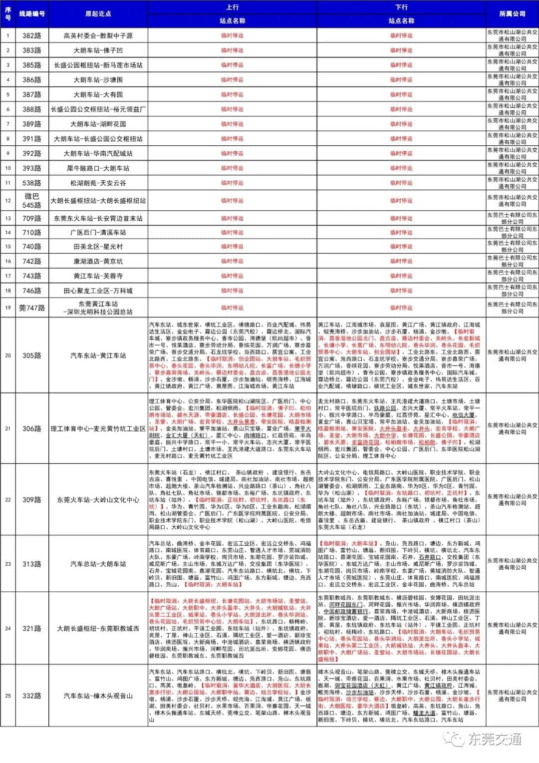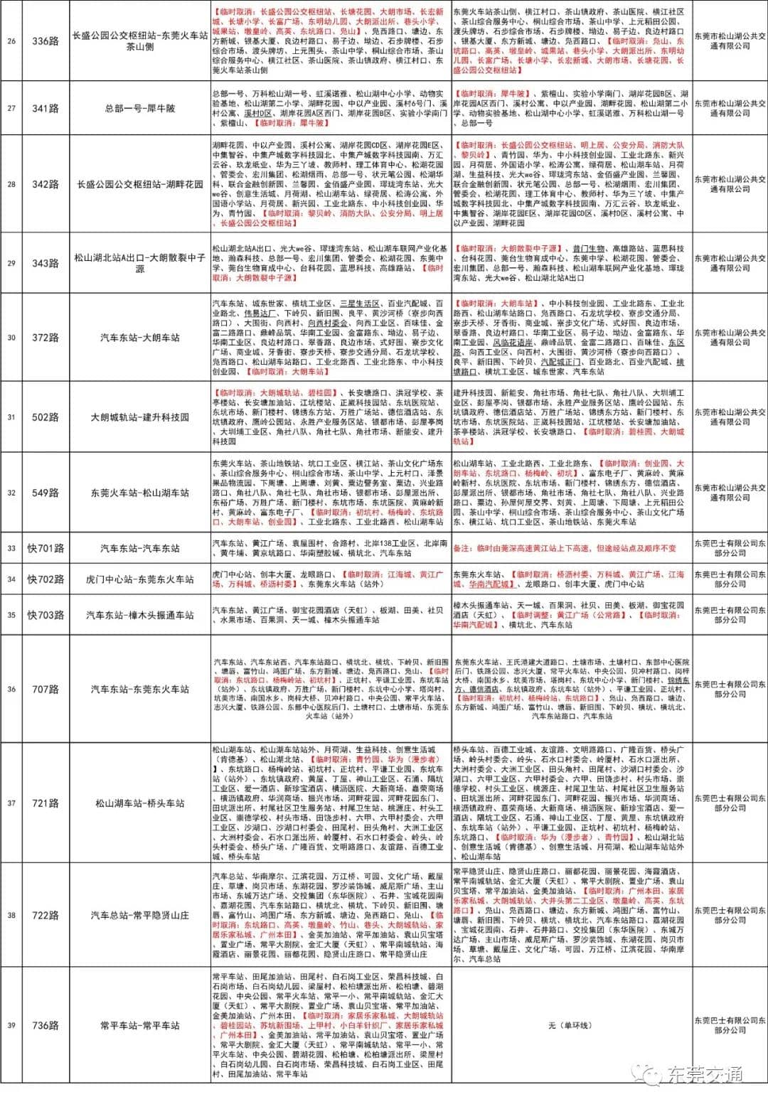 臨時停運及調(diào)整信息表