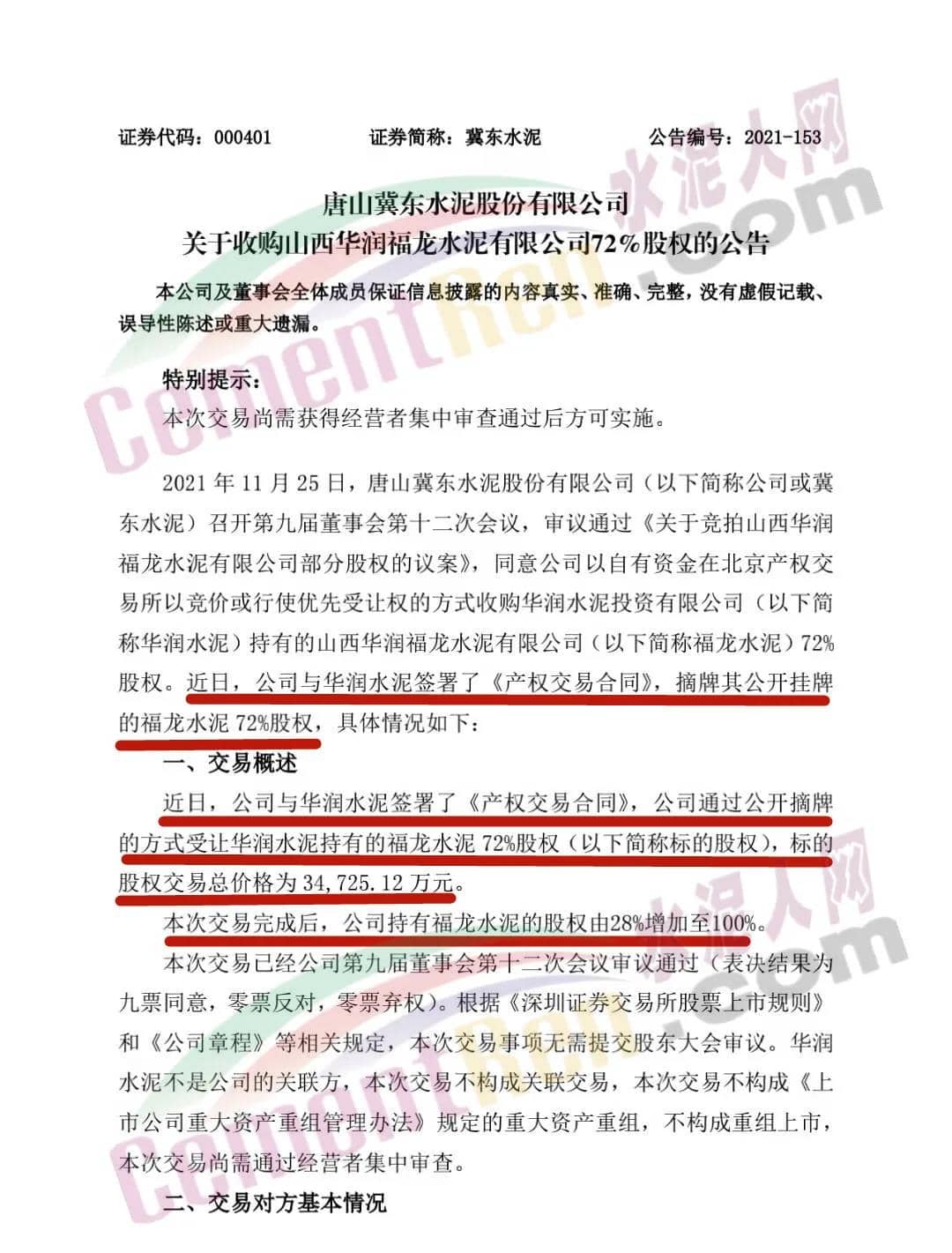 12月15日晚間,冀東水泥發(fā)布公告稱,近日,公司通過公開摘牌的方式受讓華潤水泥持有的福龍水泥72%股權(quán),標的股權(quán)交易總價格為3.47億元。此次交易完成后,公司持有福龍水泥的股權(quán)由28%增加至100%。福龍水泥擁有完整的水泥熟料生產(chǎn)線,裝備和工藝水平比較先進,擁有資源品位較好的石灰石礦山,周邊輔材豐富,生產(chǎn)成本在區(qū)域處于領(lǐng)先水平。此次交易有利于公司優(yōu)化山西區(qū)域的產(chǎn)能結(jié)構(gòu)。