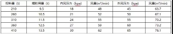 滿產(chǎn)時(shí),齒槽內(nèi)風(fēng)推薦使用壓力30kpa,最大使用壓力35kpa,外風(fēng)推薦使用壓力55kpa,最大使用壓力65kpa;投料期間,二次風(fēng)溫低于1000℃,中心風(fēng)全關(guān),高于1000℃,現(xiàn)場表壓壓力控制在5000pa以內(nèi);冷卻風(fēng)在滿產(chǎn)后開啟,2000-3000pa壓力即可。