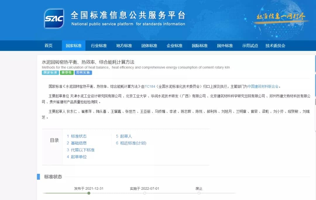 根據(jù)國家標準化管理委員會2021年第17號公告,由天津水泥院主持修訂的國家標準GB/T 26281-2021《水泥回轉(zhuǎn)窯熱平衡、熱效率、綜合能耗計算方法》、GB/T 26282-2021《水泥回轉(zhuǎn)窯熱平衡測定方法》于2021年12月31日正式發(fā)布,并將于2022年7月1日起正式實施。?