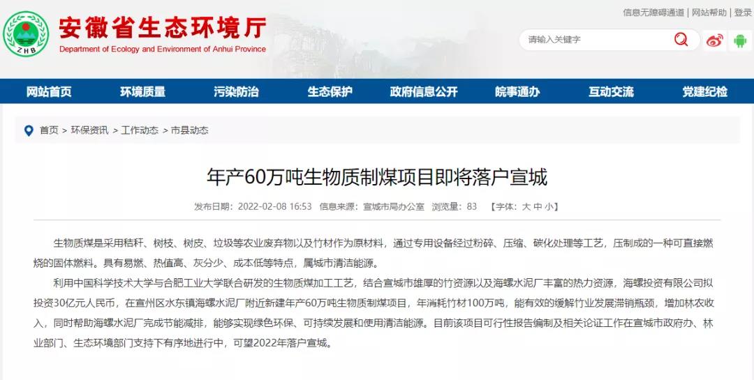 安徽省生態(tài)環(huán)境廳消息:年產(chǎn)60萬噸生物質(zhì)制煤項(xiàng)目即將落戶宣城。其中提到,海螺投資有限公司擬投資30億元人民幣,在宣州區(qū)海螺水泥廠附近新建年產(chǎn)60萬噸生物質(zhì)制煤項(xiàng)目,該項(xiàng)目可望2022年落戶宣城。