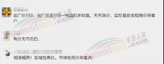 有網(wǎng)友留言表示,“出廠后返150元/噸回扣多的是,天天漲價,實際是在變相降價??蛻?rdquo;,“有價無市而已”,“明漲暗跌,區(qū)域性高價,市場性低價??土?rdquo;……