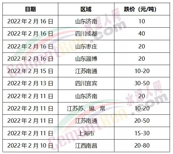 據(jù)水泥人網(wǎng)信息中心消息,近期多區(qū)域水泥價格沿續(xù)節(jié)前跌勢繼續(xù)下滑。四川成都16日跌40元/噸;四川宜賓水泥跌30-50元/噸;山東濟南節(jié)后已連續(xù)兩輪跌價,累計跌價30元/噸。2月10日前后,江蘇南昌部分廠家下調(diào)水泥價格,其中袋裝水泥下調(diào)60-80元/噸,散裝水泥下調(diào)20-40元/噸。