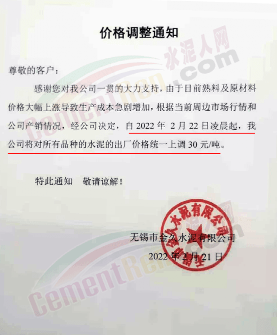 日前 ,無錫市金久水泥有限公司通知,由于目前熟料原材料價格大幅上漲導(dǎo)致生產(chǎn)成本急劇增加,根據(jù)當(dāng)前周邊市場行情和公司產(chǎn)銷情況,經(jīng)公司決定自2月22日凌晨起,公司將對所有品種的水泥出廠價統(tǒng)一上調(diào)30元/噸。