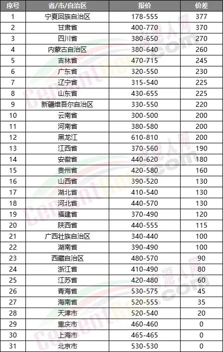 從同一省市自治區(qū)內(nèi)高低差價來入看,寧夏回族自治區(qū)、甘肅、四川、內(nèi)蒙自治區(qū)、吉林 、廣東、遼寧、山東 、新疆、云南、河南、黑龍江等區(qū)域差價均在200元/噸以及上區(qū)間。相鄰區(qū)域較大差價的存在或是“價格戰(zhàn)”導(dǎo)火索的誘因。