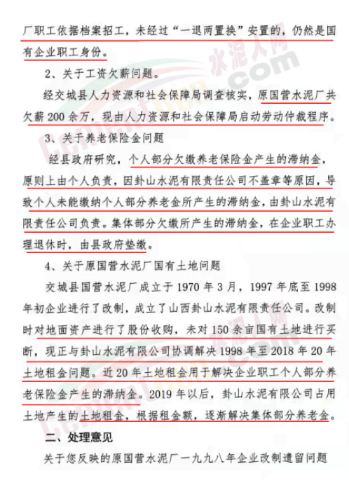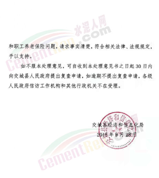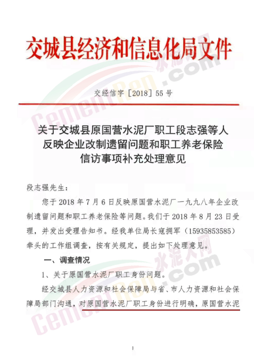 網(wǎng)友提供的文件顯示,2018年9月28日,交城縣經(jīng)信局《關(guān)于交城縣原國(guó)營(yíng)水泥廠職工段志強(qiáng)等人反映企業(yè)改制遺留問(wèn)題和職工養(yǎng)老保險(xiǎn)信訪事項(xiàng)補(bǔ)充處理意見(jiàn)》的文件提到,段志強(qiáng)于2018年7月6日反映原國(guó)營(yíng)水泥廠一九九八年企業(yè)改制遺留問(wèn)題和職工養(yǎng)老保險(xiǎn)等問(wèn)題。已于當(dāng)年8月23日受理,并發(fā)出受理告知書。工作組調(diào)查,按有關(guān)規(guī)定,提出如下處理意見(jiàn)。