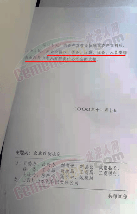 2000年交城縣《關(guān)于交城縣水泥廠改制為山西卦山水泥有限責(zé)任公司的決定》文件中提到,經(jīng)縣委、政府1997年12月19日企業(yè)改制領(lǐng)導(dǎo)組會(huì)議研究決定,由原交城縣水泥廠職工集資入股,成立山西卦山水泥有限公司。