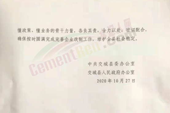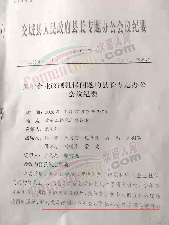 日前,有網(wǎng)友向水泥人網(wǎng)反映,交城縣原國(guó)營(yíng)水泥廠企業(yè)改制遺留問(wèn)題和職工養(yǎng)老保險(xiǎn)問(wèn)題至今未得到解決幾點(diǎn)問(wèn)題。