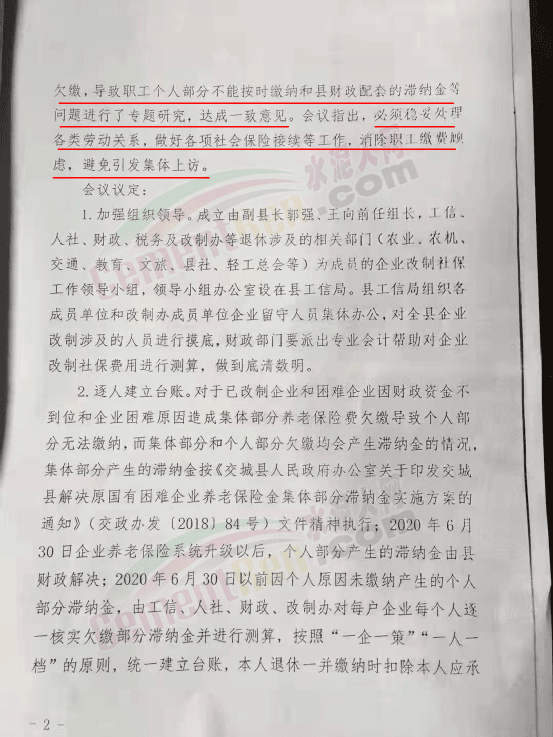 交城縣2020年11月17日《關(guān)于企業(yè)改制社保問(wèn)題的縣長(zhǎng)專題辦公會(huì)議紀(jì)要》中提到會(huì)議針對(duì)改制和困難企業(yè)集體部分養(yǎng)老保險(xiǎn)費(fèi)存在欠繳,導(dǎo)致職工個(gè)人部分不能按時(shí)繳納和縣財(cái)政配套的滯納金等問(wèn)題進(jìn)行了專題研究,且達(dá)成了一致意見(jiàn)。會(huì)議指出,必須穩(wěn)妥處理各類勞動(dòng)關(guān)系,做好各項(xiàng)社會(huì)保險(xiǎn)接續(xù)等工作,消除職工繳費(fèi)顧慮,避免引發(fā)集體上訪。