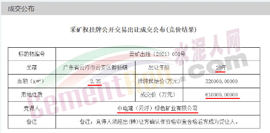 日前,中電建(云?。┚G色礦業(yè)有限公司以61億天價(jià)拍下云浮市云安區(qū)都楊鎮(zhèn)觀音山礦區(qū)建筑用花崗巖礦采礦權(quán),刷新了2022年礦權(quán)出讓記錄,這也意味著海螺水泥又一次痛失“采礦權(quán)”。