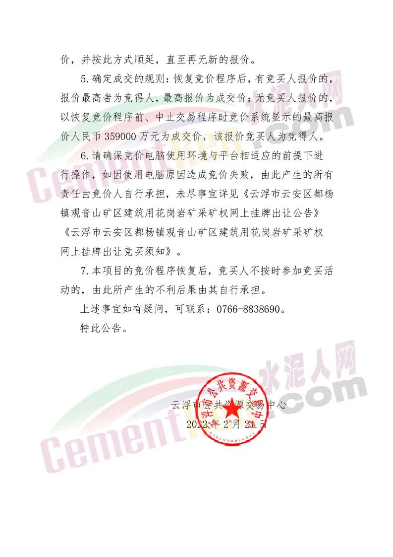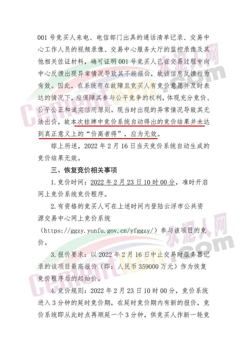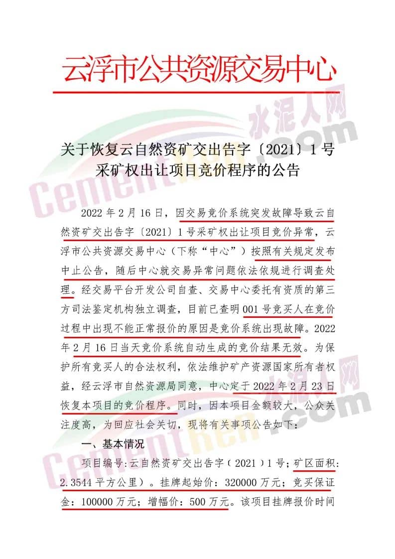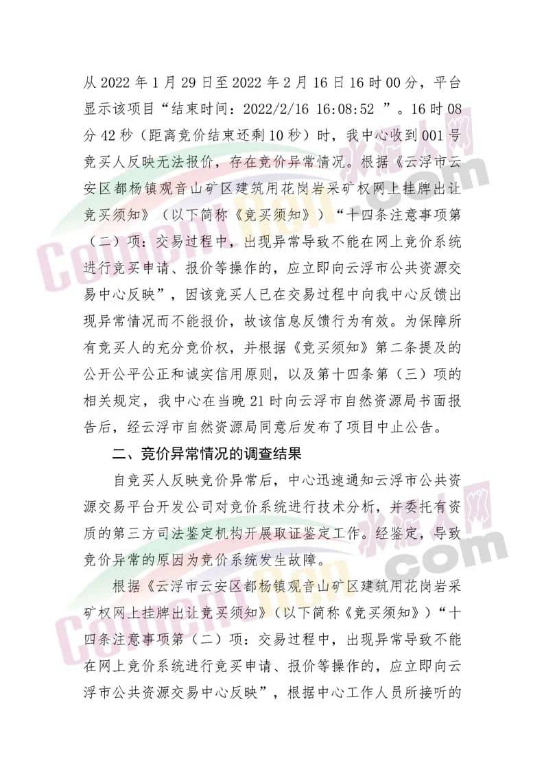 云浮市公共資源交易中心《關(guān)于恢復(fù)云自然資礦交出告字(2021〕1號(hào)采礦權(quán)出讓項(xiàng)目競(jìng)價(jià)程序的公告》稱,經(jīng)查明001號(hào)競(jìng)買人在競(jìng)價(jià)過程中出現(xiàn)不能正常報(bào)價(jià)的原因是競(jìng)價(jià)系統(tǒng)出現(xiàn)故障。2022年2月16日當(dāng)天競(jìng)價(jià)系統(tǒng)自動(dòng)生成的競(jìng)價(jià)結(jié)果無效。