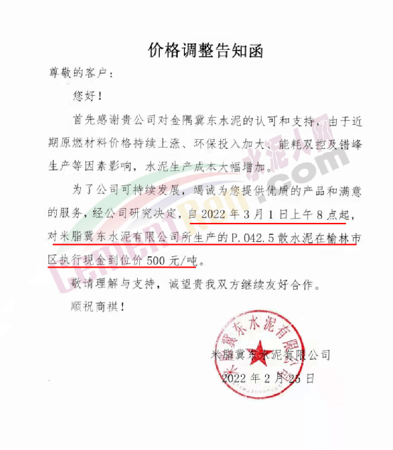 同日,陜西米脂冀東水泥通知由于近期原燃材料價格持續(xù)上漲、環(huán)保投入加大、能耗雙控及錯峰生產(chǎn)等因素影響,水泥生產(chǎn)成本大幅增加。為了公司可持續(xù)發(fā)展,經(jīng)研究決定,自3月1日上午8時起,對米脂冀東水泥有限公司所生產(chǎn)的P.O42.5散裝水泥在榆林市區(qū)域執(zhí)行現(xiàn)金到位價500元/噸。