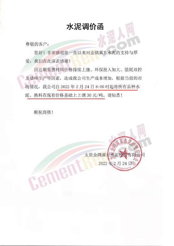 據(jù)了解,日前山西太原及周邊幾家企業(yè)通知上調(diào)所有品種水泥、熟料價格30元/噸。其中,太原金隅冀東水泥經(jīng)貿(mào)有限公司通知,因近期原燃材料價格持續(xù)上漲、環(huán)保投入加大、能耗雙控及錯峰生產(chǎn)等因素,造成企業(yè)生產(chǎn)成本增加,根據(jù)當前市場情況,公司自2月24日8時起將所有品種水泥、熟料價格在現(xiàn)有基礎(chǔ)上上調(diào)30元/噸。