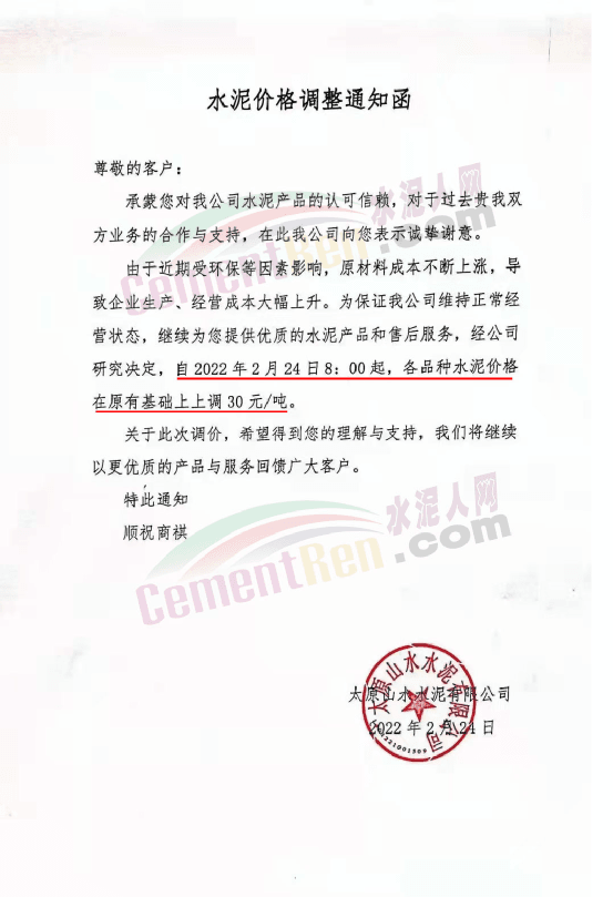 太原山水水泥有限公司通知由于近期受環(huán)保等因素影響,原材料成本不斷上漲,導(dǎo)致企業(yè)生產(chǎn)、經(jīng)營成本大幅上升,為保證公司正常經(jīng)營,經(jīng)公司研究決定,自2月24日 8時起,各品種水泥價格在原有基礎(chǔ)上上調(diào)30元/噸。