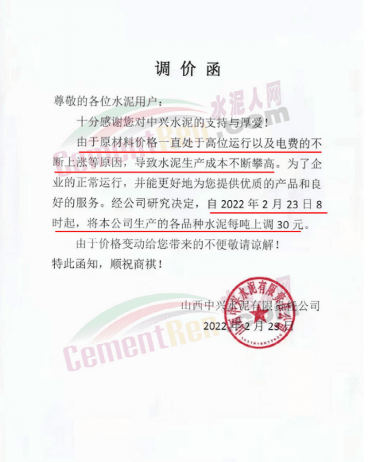 山西中興水泥有限公司通知,由于原材料價格一直處于高位運行以及電費的不斷上漲等原因,導(dǎo)致水泥生產(chǎn)成本不斷攀高。為了企業(yè)的正常運行,經(jīng)公司研究決定,自2月23日8時起,將公司生產(chǎn)的各品種水泥上調(diào)30元/噸。