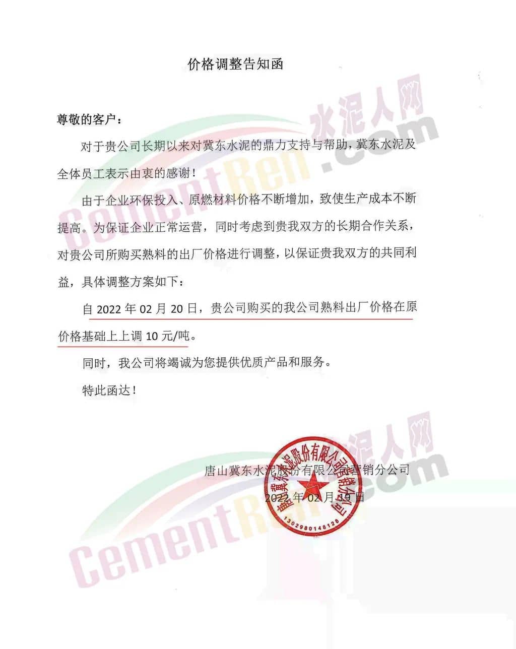 另據(jù)水泥人網(wǎng)信息中心消息,近期河北省內(nèi)多家企業(yè)通知上調(diào)熟料價格。唐山冀東水泥股份有限公司營銷分公司通知由于企業(yè)環(huán)保投入、原燃材料價格不斷增加,致使生產(chǎn)成本不斷提高。為保證企業(yè)正常運營,自2月20日起,熟料出廠價在原基礎(chǔ)上上調(diào)10元/噸。