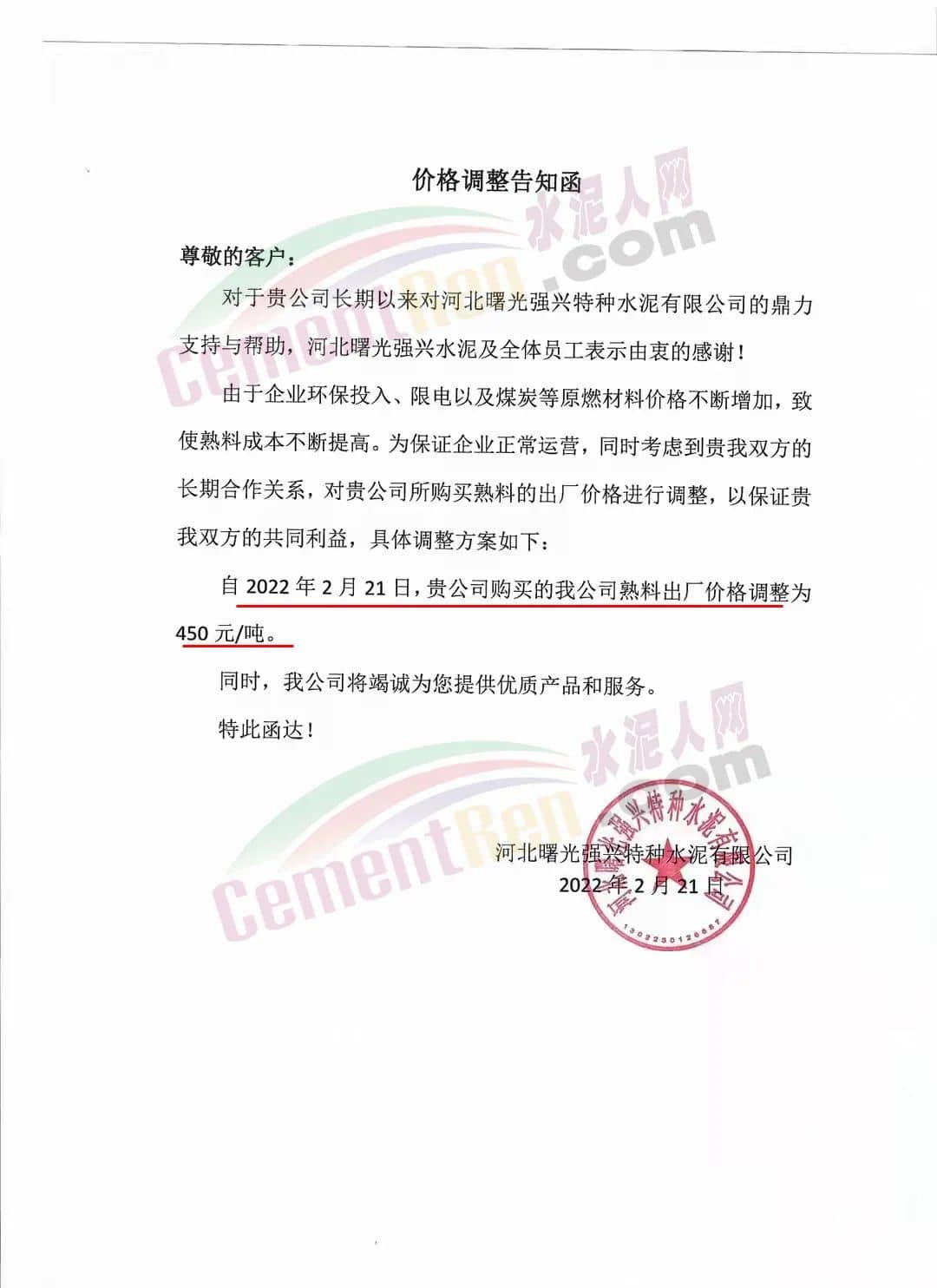 灤縣磐石水泥有限公司及河北曙光強興特種水泥有限公司通知,由于環(huán)保投入、限電以及煤炭等原燃材料價格不斷增加,致使熟料成本不斷提高。為保證企業(yè)正常運營,自2月21日起公司熟料出廠價格調(diào)整為450元/噸。