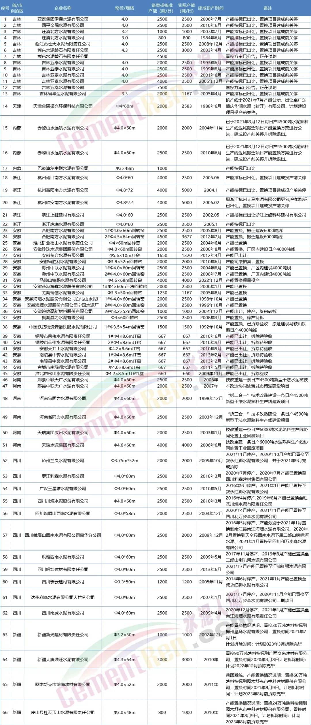 近日吉林、天津、內(nèi)蒙、浙江、安徽、山東 、河南、四川、云南、新疆、寧夏等多個省市自治區(qū)公布了截止2021年底水泥熟料生產(chǎn)線清單,其中明確提到各區(qū)域產(chǎn)能置換退出生產(chǎn)線清單。據(jù)不完全統(tǒng)計合計退出66條生產(chǎn)線,合計產(chǎn)能達4465.86萬噸/年。