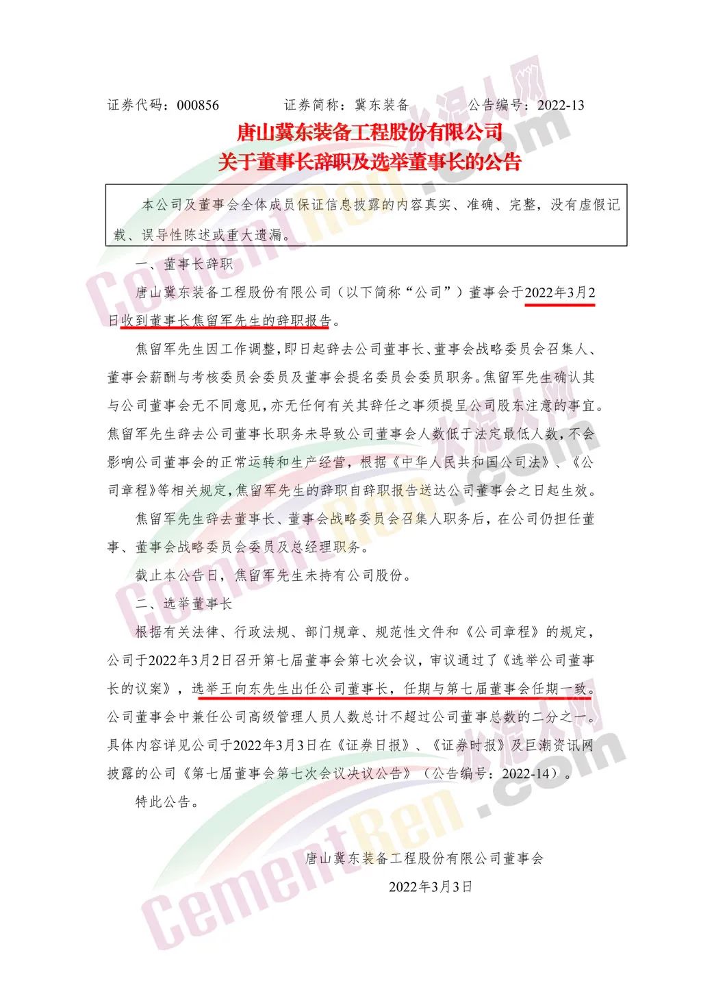 冀東裝備3月2日晚間公告,公司董事會于2022年3月2日收到董事長焦留軍的辭職報告。焦留軍因工作調(diào)整,即日起辭去公司董事長、董事會戰(zhàn)略委員會召集人、董事會薪酬與考核委員會委員及董事會提名委員會委員職務(wù)。焦留軍辭去董事長、董事會戰(zhàn)略委員會召集人職務(wù)后,在公司仍擔任董事、董事會戰(zhàn)略委員會委員及總經(jīng)理職務(wù)。