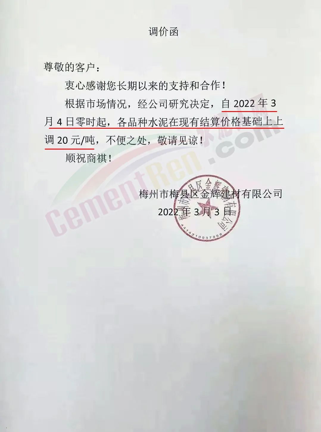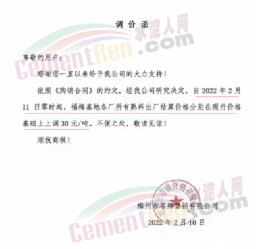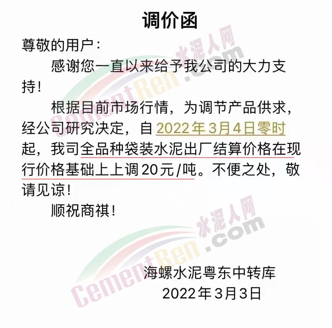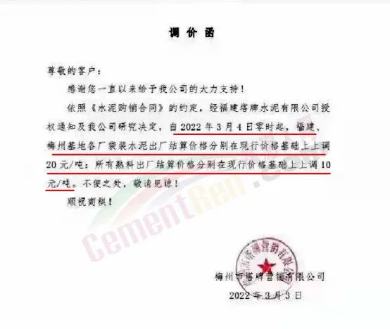 梅州市梅縣區(qū)金輝建材有限公司通知,根據(jù)市場情況,經(jīng)公司研究決定,自2022年3月4日零時(shí)起,各品種水泥在現(xiàn)有結(jié)算價(jià)格基礎(chǔ)上上調(diào)20元/噸。