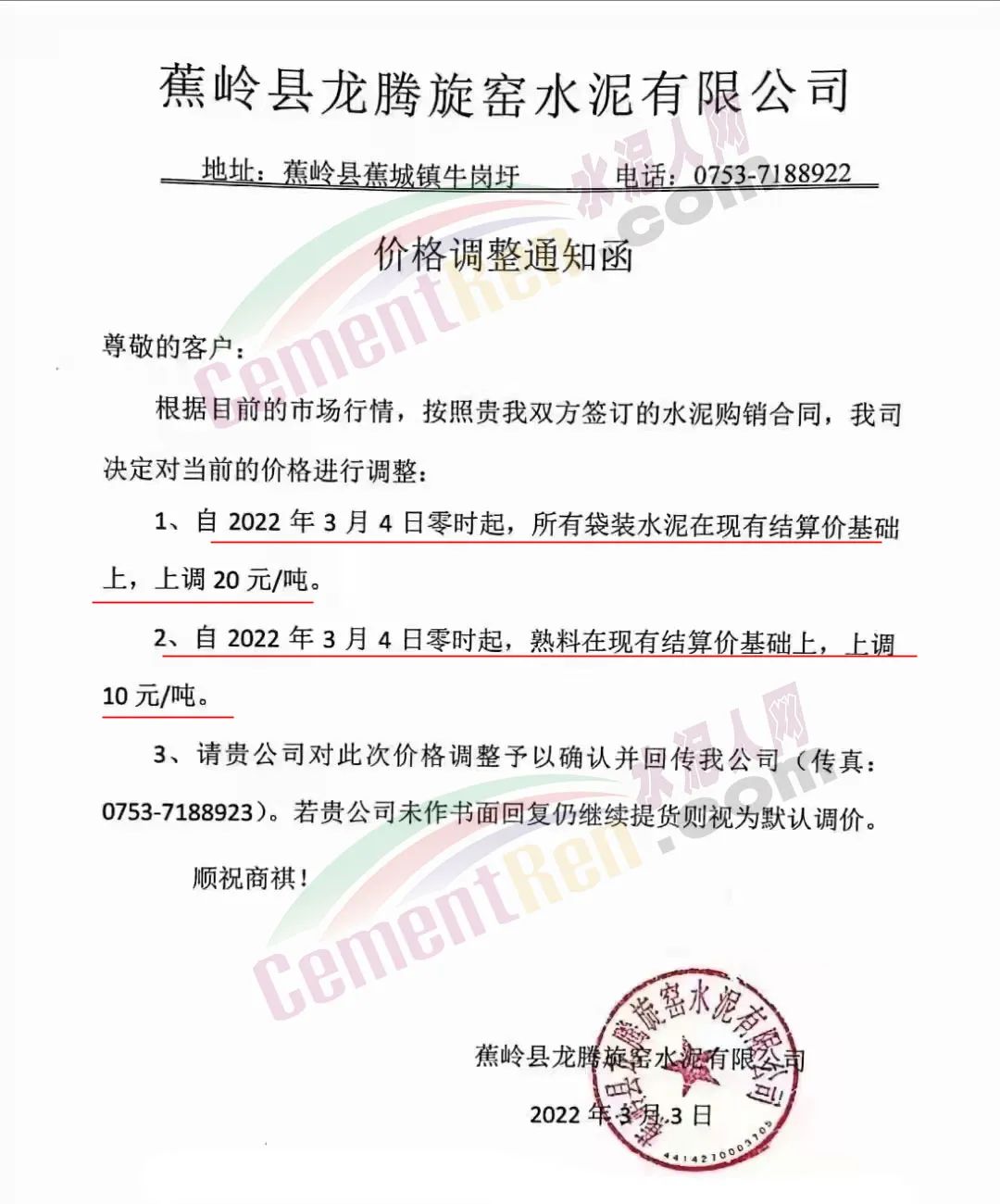 蕉嶺縣龍騰旋窯水泥有限公司通知,根據(jù)目前的市場行情,決定對(duì)當(dāng)前的價(jià)格進(jìn)行調(diào)整。自2022年3月4日零時(shí)起,所有袋裝水泥在現(xiàn)有結(jié)算價(jià)基礎(chǔ)上上調(diào)20元/噸,熟料在現(xiàn)有結(jié)算價(jià)基礎(chǔ)上上調(diào)10元/噸。