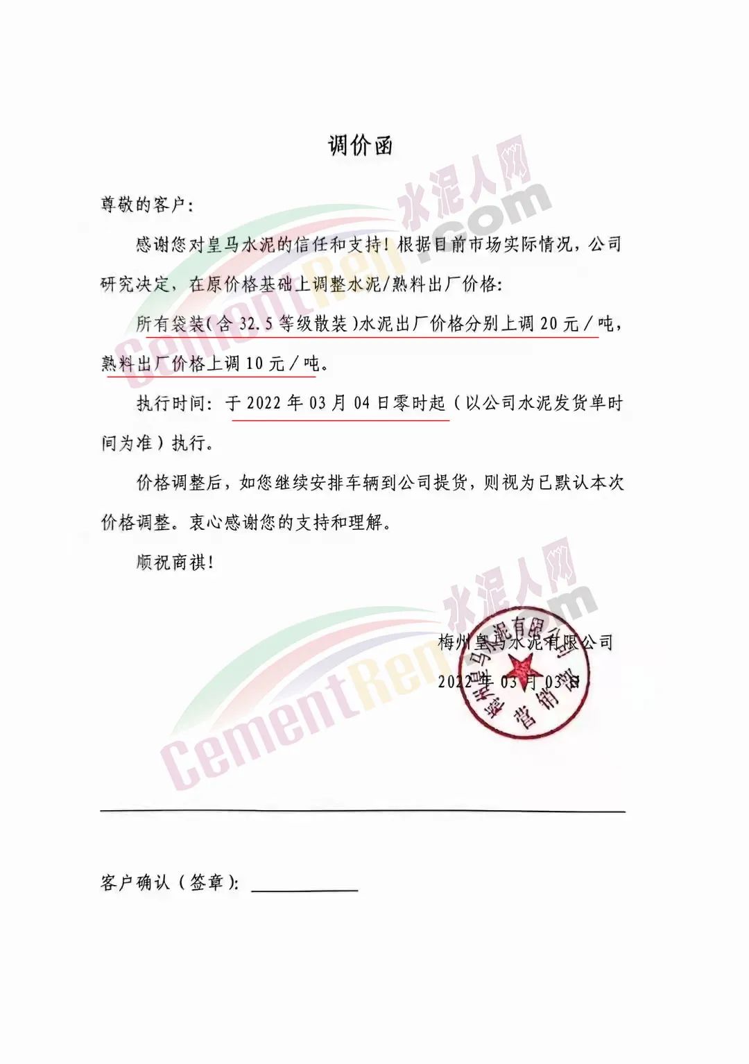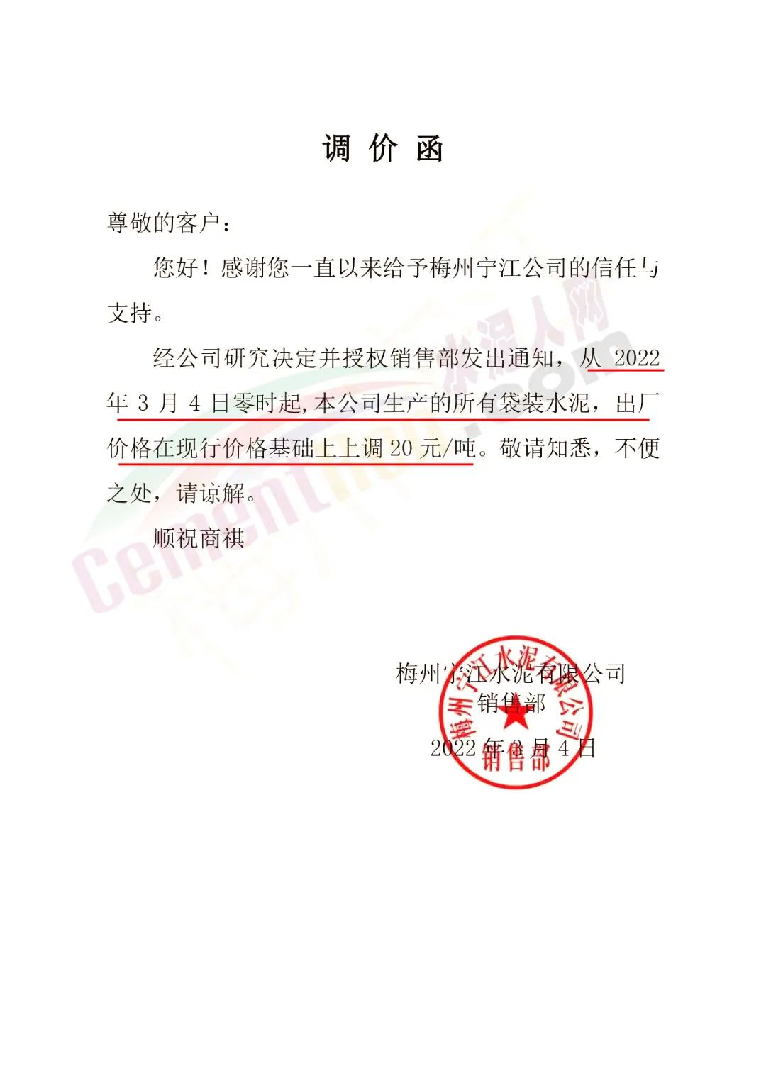 梅州寧江水泥有限公司銷售部通知,經(jīng)公司研究決定并授權(quán)銷售部發(fā)出通知,從2022年3月4日零時(shí)起,本公司生產(chǎn)的所有袋裝水泥,出廠價(jià)格在現(xiàn)行價(jià)格基礎(chǔ)上上調(diào)20元/噸。