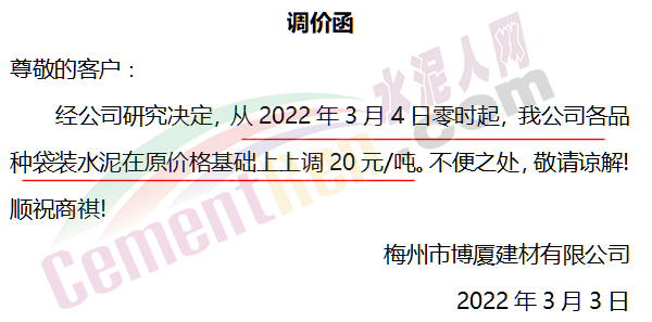 梅州市博廈建材有限公司通知從2022年3月4日零時(shí)起,公司各品種袋裝水泥在原價(jià)格基礎(chǔ)上上調(diào)20元/噸。