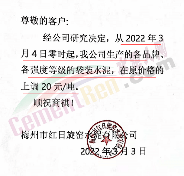 梅州市紅日旋窯水泥有限公司通知從2022年3 月4日零時(shí)起,各品牌、各強(qiáng)度等級(jí)的袋裝水泥,在原價(jià)格的上調(diào) 20元/噸。