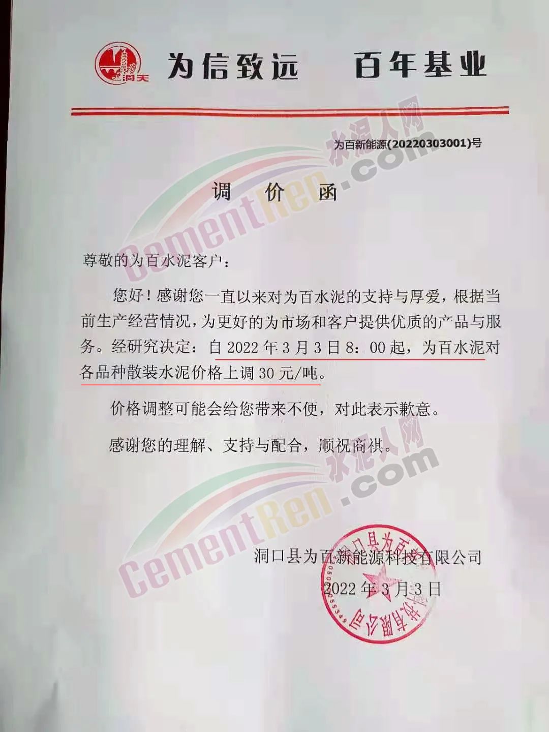 湖南省邵陽市洞口縣為百新能源料技有限公司通知,根據(jù)當(dāng)前生產(chǎn)經(jīng)營情況,為更好的為市場和客戶提供優(yōu)質(zhì)的產(chǎn)品與服務(wù)。經(jīng)研究決定自 2022年3月3日8時(shí)起,為百水泥對(duì)各品種散裝水泥價(jià)格上調(diào)30元/噸。