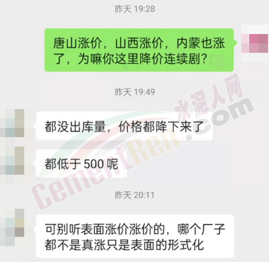 保定區(qū)域一建材貿(mào)易商對(duì)水泥人網(wǎng)表示,目前河北保定區(qū)域多數(shù)企業(yè)都沒有出庫量,價(jià)格都降下來了,P.O42.5散裝水泥報(bào)價(jià)多在500元/噸以下。“可別聽表面上漲價(jià)的,那些都不是真漲,只是表面的形式化”。上述貿(mào)易商對(duì)水泥人網(wǎng)表示,已經(jīng)有企業(yè)開始降價(jià)了,啥時(shí)候能止跌還不確定,但是降價(jià)很有可能“拍成連續(xù)劇”。